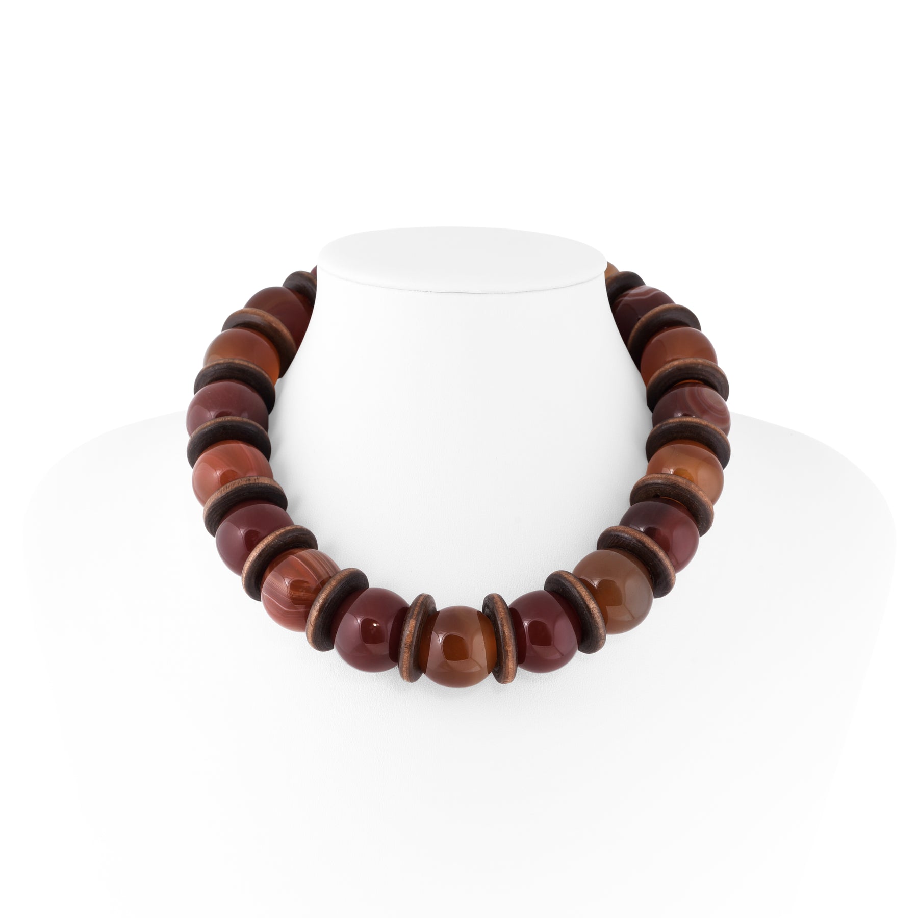 É um belíssimo colar elaborado com várias esferas de Ágata na cor âmbar combinadas ao detalhe da madeira entre cada uma delas nos tons vermelho alaranjado com toques de amarelo, acessório ideal  para compor vários looks proporcionando um acabamento  perfeito ao colo devido a sua exuberância, as cores neutras das pedras faz dele uma peça para  todas as estações do ano, especialmente na Primavera Verão onde as roupas são mais leves e o corpo fica mais a mostra, imagina com uma roupa de praia que luxo!!!