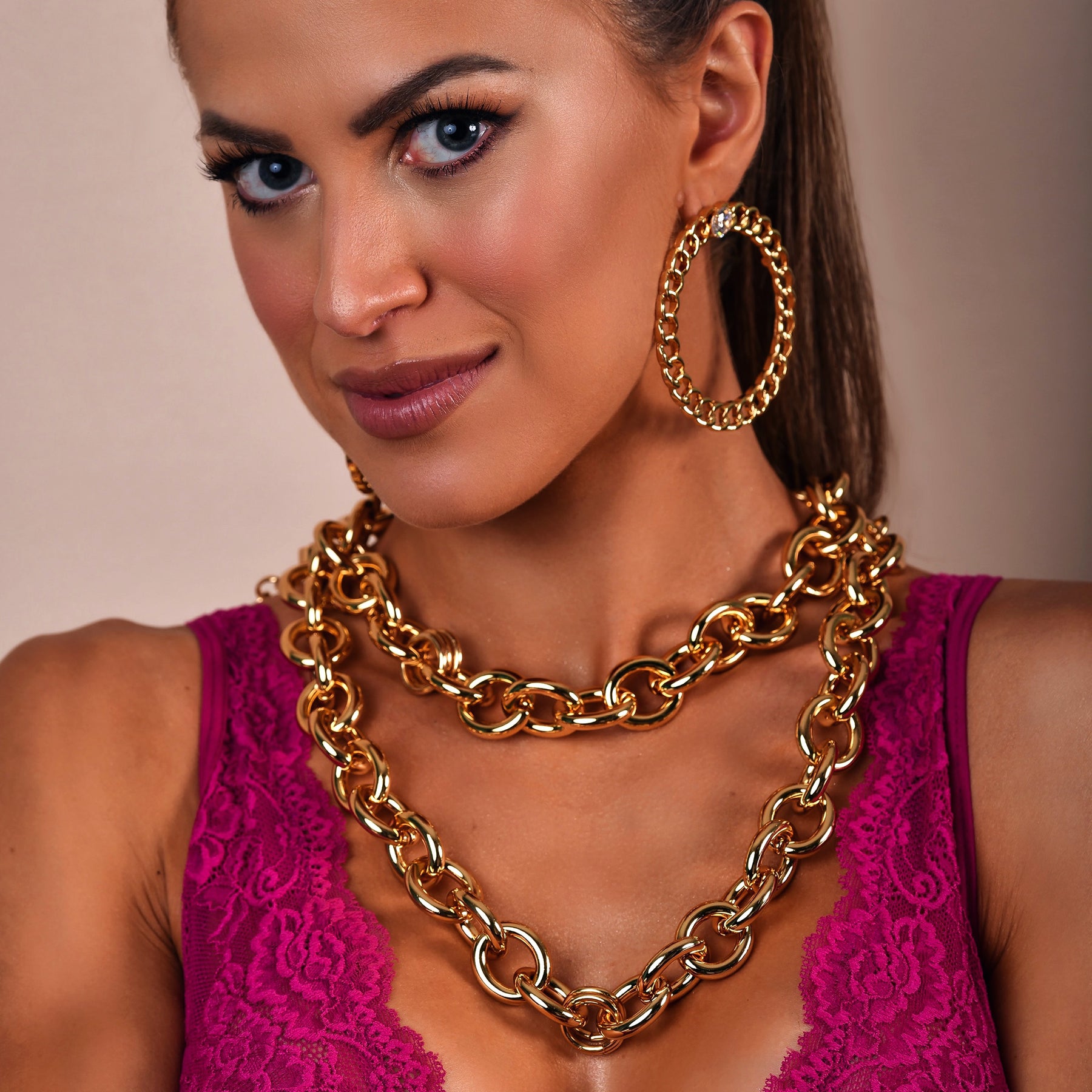 Com elos arredondados e muito bem estruturados, com uma corrente de ajuste estilo português, e com um lindo pingente de cabeça de leão como acabamento, possibilita inúmeras composições, de gargantilha a um belíssimo Maxi colar, nas versões Gold, Silver & Ônix.
